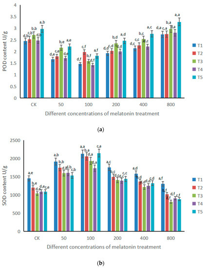 Previously, several studies have shown that salinity and alkali stress can alter the activity of plant antioxidant enzymes [29,30,31]. Normally, SOD can decompose ROS into H2O2. H2O2 is decomposed into H2O and O2 under the action of POD and CAT [32,33]. In this experiment, different doses of exogenous melatonin were used to alleviate the stress of “Xin Lin 1” growing in saline-alkali soil. The results showed that 50 μM and 100 μM melatonin could significantly increase SOD and CAT activities in leaves, and 800 μM melatonin was more inclined to induce POD, but its activity induction was not significant, and it tended to inhibit CAT activity. In addition, the secretion laws of the three enzymes fluctuated with time, among which SOD and CAT fluctuated the most. Our finding was in accordance with previous studies [34]. The Jiang et al. [35] study also showed that low concentration of exogenous melatonin can significantly enhance the antioxidant enzyme activity in plants.
