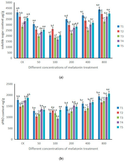 Furthermore, plant cells increase the intracellular water potential by accumulating small organic molecules such as proline, soluble sugar, and soluble protein to maintain their own water retention capacity [36,37]. In this experiment, different doses of exogenous melatonin could significantly change the accumulation level of related substances. The content of osmotic regulators induced by low levels of melatonin (50 μM, 100 μM) was significantly lower than that of the control group. This indicated that under the induction of low concentrations of melatonin, the stress intensity of plants was reduced. As an important indicator for judging the level of oxidative stress in plant cells [38], the results of proline showed that the treatment effect of 100 μM was better than that of 50 μM. On the 22th day of the experiment, the proline content induced by 100 μM was 58% of that induced by 50 μM. In contrast, the 800 μM treatment group induced slightly higher osmolyte levels than the control group. Chlorophyll is an important pigment that absorbs light energy during photosynthesis in higher plants [39]. In this experiment, its variation law is presented with fluctuations. Our result was in accordance with previous studies in Brassica juncea [40] and kiwifruit [41].