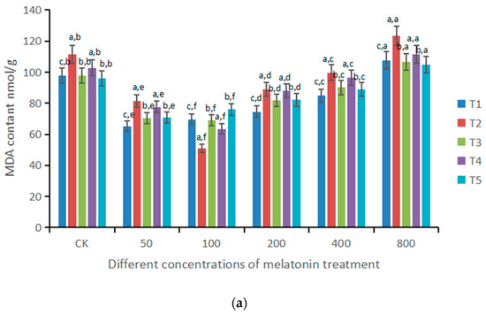 In order to detect the alleviating effect of melatonin on stress, we systematically analyzed the changes of MDA and chlorophyll content in each experimental group, as shown in Figure 4. The change trend of MDA in each experimental group showed a trend of first an increase and then a decrease. It was clearly shown that 50 μM and 100 μM melatonin had the best alleviation effect. The result of 800 μM was slightly higher than that of the control group, indicating that the high concentration of melatonin aggravated the stress effect. Furthermore, the change of chlorophyll showed a trend of first a decrease and then an increase. The chlorophyll content of each experimental group usually reached the lowest value in the T3 stage (18 d) or T4 stage (22 d) of the experiment.