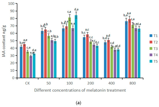 Figure 5 shows the effect of exogenous melatonin on growth-promoting hormone in plants under stress. Relatively speaking, the three growth-promoting hormones showed a decreasing trend. Compared with the control group, the treatment of each experimental group increased the auxin level in the plant and inhibited the level of GA and CTK. Among them, 100 μM and 800 μM had the most significant effects on the levels of three endogenous hormones. The treatment effect of 400 μM melatonin was not obvious. Finally, it is worth noting that the plants treated with 100 μM of exogenous melatonin had a tendency to exuberantly secrete IAA.