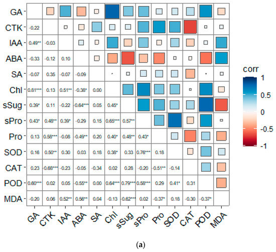 Correlation of physiological indexes of Populus cathayana × canadansis ‘Xin Lin 1’ under 100 μM (a) and 800 μM (b). The size of the solid square indicates the correlation degree, with blue representing positive correlation and red representing negative correlation. Images use *, ** and *** to indicate the significance between indicators. * means p value < 0.1; ** means p value < 0.05; *** means p value < 0.01.