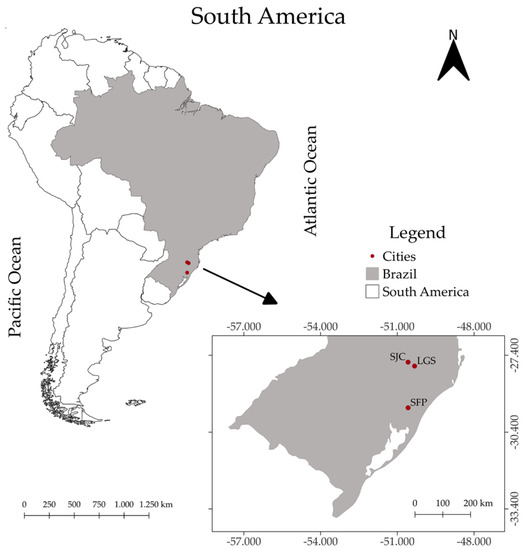 The study was conducted in areas with a natural predominance of Araucaria angustifolia (Bertol.) Kuntze in MOF (See Figures S1 and S2 in Supplementary Material), located in the municipalities of Lages (LGS) and São José do Cerrito (SJC), from the state of Santa Catarina (SC), and São Francisco de Paula (SFP) in the state of Rio Grande do Sul (RS). All three study areas are located in the southern region of Brazil (Figure 1).