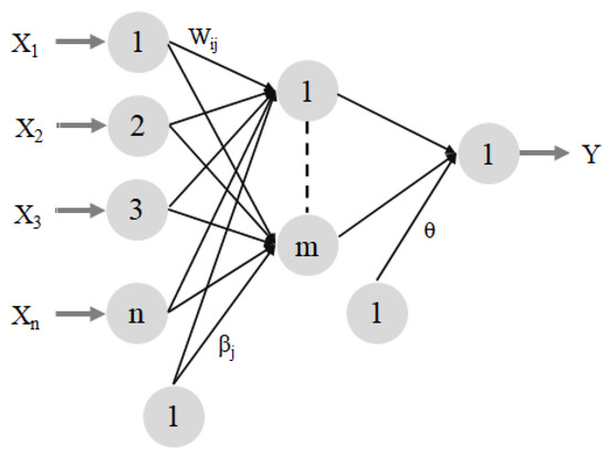 where: Y = estimation of the value of the dependent variable; Xi = input value of the i-th independent variable; wij = connection weight between the i-th input neuron and the j-th neuron of the hidden layer; βj = bias value of the j-th neuron of the hidden layer; vj = connection weight between the j-th neuron of the hidden layer and the output neuron; θ = bias value of the output neuron; f(.) = hidden layer activation function; and g(.) = output activation function.