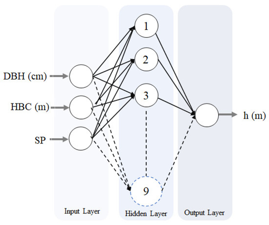 ANN is one of the most common modeling techniques with a highly interconnected structure like a human brain system that emulates the operations and connectivity of biological neurons [24,25]. There are complex relationships between tree dendrometrical dimensions to biomass in the natural forest ecosystems. Since the nature of such relationships in the natural ecosystems is unknowable, the ANN models are expected to be more accurate than traditional regression models [26]. Additionally, using ANN allows us to synthesize information in a single network, being advantageous when working with a large amount of data from different locations, genotypes, climatic conditions, site index, and silvicultural interventions, among other characteristics of the site that influence the tree’s growth. With ANN, continuous and categorical variables can be used simultaneously in a single trained network, reaching accurate estimates.