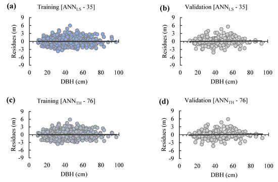 The graphical residual distribution of the best-trained networks considering the number of 6 neurons in the hidden layer is presented in Figure 4 and is based on both the Logistic Sigmoid (LS) through DN [0, 1] and the Tangent Hyperbolic (TH) AF through DN [−1, 1] (ANNLS-35 and ANNTH-76). A good residual dispersion is evidenced, by proportionality, among over-estimated and under-estimated values across all diametric classes. Furthermore, based on the dataset evaluated in our study, AF variations (LS and TH) showed quite a similar accuracy and residues distribution.