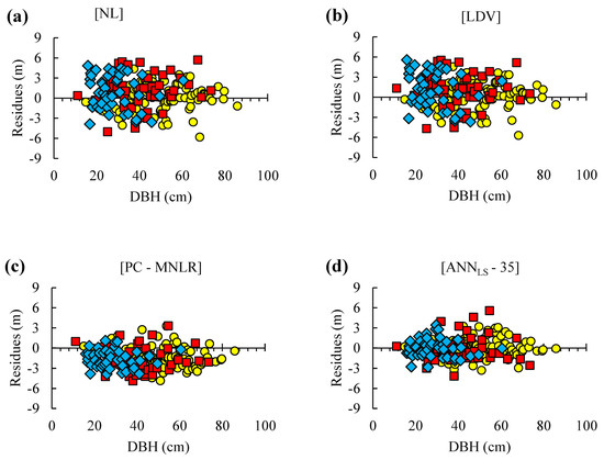 Residual distribution of the four compare methodologies using the validation data for estimating Brazilian pine height. NL: Non-linear (a). LDV: Linear with Dummy Variables (b). PC-MNLR: Principal Component with Mixed Non-linear Regression (c). ANNLS–35: Artificial Neural Networks (d). The colors mean the Sociological Position (SP) of the tree in the forest, where: dominant-SP1 (yellow), codominant-SP2 (red), and dominated-SP3 (blue).