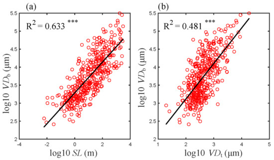 Log−log scaling relationships between VDb and SL (a) and VDt (b). R2 is indicated in each panel. Asterisks indicate levels of significance (*** p < 0.001). Abbreviations for traits are the same as in Table 1.