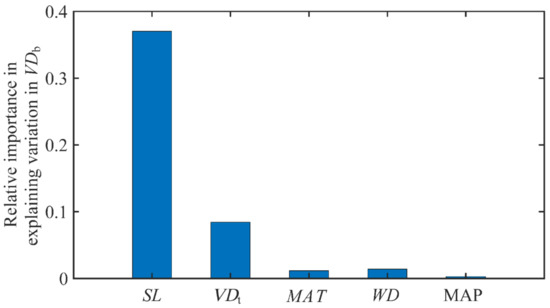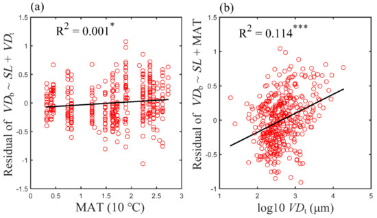 To further evaluate the importance of each variable, an analysis on residual variations was performed. First, a multiple linear regression was performed on SL and VDt with respect to VDb, and the obtained residual variations in VDb were linearly correlated to T (Figure 3a). However, it was found that (Figure 3a) merely a weak correlation was obtained, and MAT only explained 0.1% of the residual variations in VDb (Figure 3a). When the contribution of SL and MAT to VDb was eliminated following the same analysis procedure, the residual variation of VDb was still significantly related to VDt, and VDt still explained 11.4% of the residual variation in VDb (Figure 3b). Evidently, VDt is a non-negligible variable in determining VDb.