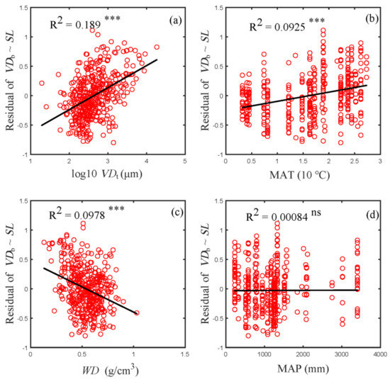Relationship between residual variation in VDb and VDt (a), MAT (b), WD (c) and MAP (d). Residual variation of VDb was obtained after eliminating the contribution of SL to VDb through linear regression. R2 is indicated in each panel. Asterisks indicate levels of significance (ns, p > 0.05; *** p < 0.001). Abbreviations for traits and environmental variables are the same as in Table 1.