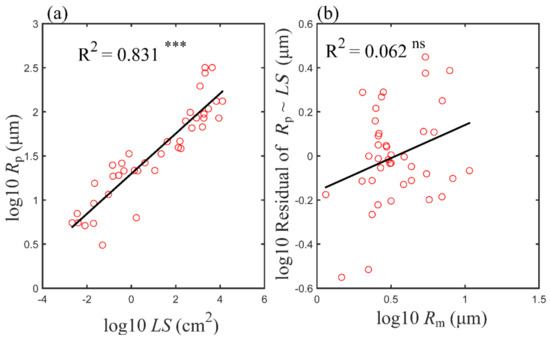 Log−log scaling relationship between leaf size (LS) and the hydraulic radius of petiole vessels, Rp (a), and the residual variation of Rp (after eliminating the contribution of LS through linear regression) vs. the hydraulic radius of minor vein vessels, Rm (b). R2 is indicated in each panel. Asterisks indicate levels of significance (ns, p > 0.05; *** p < 0.001). Abbreviations for traits are the same as in Table 1.