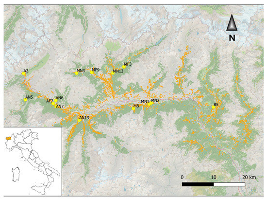 Altitude and exposure data were retrieved from the digital terrain model of the Valle d’Aosta region (https://mappe.partout.it/pub/geonavitg/geodownload.asp?carta=DTM0508, accessed on 26 May 2022); solar radiation data were retrieved from the regional geoportal navigator (Navigatore Cartografico SCT-3.31.0, https://mappe.regione.vda.it/pub/geoCartoSCT/, accessed on 1 June 2022).