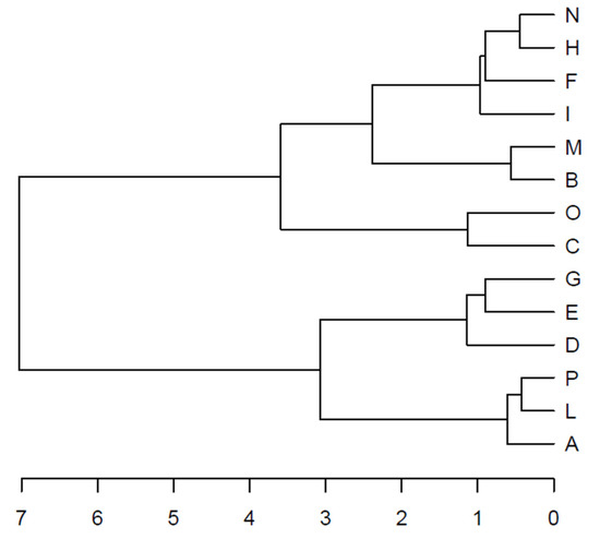 The PCA resulted in four PCs, the eigenvalues of which matched the Kaiser criterion in PC1 (eigenvalue, 1.981) and PC2 (eigenvalue, 1.005), while all other PCs displayed eigenvalues lower than one. PC1 and PC2 accounted for 49.5% and 25.1% of the total variance, respectively, resulting in a two-dimensional PC space associated with a cumulated variance explained at 74.6%. PC1 was positively correlated with el (R = 0.920) and followed in magnitude by sr (R = 0.746) and sv (R = 0.742), while the correlation with sl was milder and negative (R = −0.166). Conversely, PC2 was mostly correlated with sl (R = 0.971), while the correlation with the other site variables was lower than 0.2 in modulus (R = 0.167 for el, 0.138 for sr, and −0.128 for sv). The plot displaying the sampling sites in the PC space showed the presence of two distinct groups, one lying on the first and fourth quadrants (sites A, D, E, G, L, and P), and the other on the second and fourth quadrants (sites B, C, F, H, I, M, N, and O) (Figure 2).