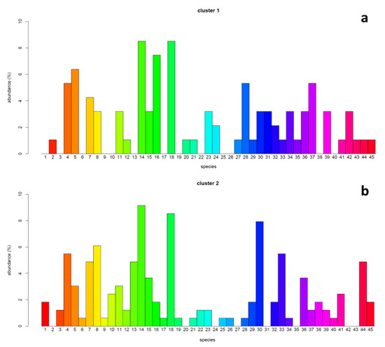 Bar chart of the abundance (%) of the different species of lichens present in the two clusters of sites. The abundance is shown on the y-axis, while the x-axis reports the number of the corresponding species (see Table S2). Panel (a) refers to cluster 1, panel (b) to cluster 2.