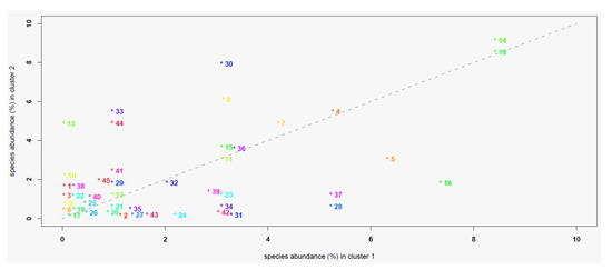 Scatterplot of the relative abundance (%) of the lichen species in the two clusters of sites. The relative abundance of each species is reported on the x-axis for cluster 1 and on the y-axis for cluster 2. Points represent the corresponding lichen species (see main text for the acronym legend): species whose associated point lies in proximity of the bisector line display comparable abundances between the different clusters, those lying over the line are more abundant in cluster 2 than in cluster 1, while the remaining ones are more abundant in cluster 1 than in cluster 2.