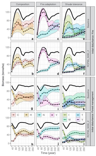 The results of the Baseline successional simulations were generally consistent with current observations of the successional pathways in the study area. Moreover, simulated current biomass (t = 0) was consistent with the actual biomass reported in the NFI forest cover maps [47,65].