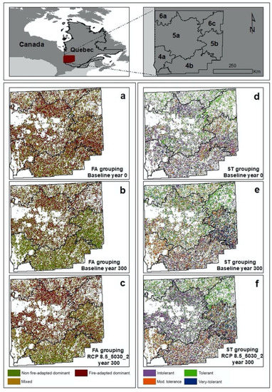 Simulations of fire adaptation (FA) and shade tolerant (ST) functional groups of trees in the Boreal Forest of Quebec under the Baseline and RCP 8.5 5032_2% scenarios at the beginning (year 0) and at the end of the simulation (year 300) for the study area. (a) Fire adaptation functional group in the Baseline scenario at the beginning of the simulation period, (b) fire adaptation functional group in the Baseline scenario at the end of the simulation period, (c) fire adaptation functional group in the RCP 8.5 5030_2% scenario at the end of the simulation period, (d) shade-tolerant functional group in the Baseline scenario at the beginning of the simulation period, (e) shade-tolerant functional group in the Baseline scenario at the end of the simulation period, (f) shade-tolerant functional group in the RCP 8.5 5030_2% scenario at the end of the simulation period. White areas on the map represent agricultural areas or water bodies.