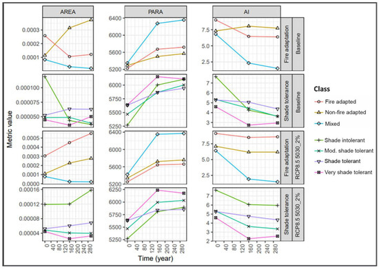 The landscape metrics showed that the stands dominated by non-fire-adapted species increased in mean area (AREA) over time, whereas the stands dominated by mixed and fire-adapted species decreased under the Baseline scenario (Figure 4). We also noted a simultaneous increase in shape complexity (PARA), which indicated an increase of border area and a decreased stand aggregation (AI). Metrics for the shade tolerance functional group showed that stands dominated by shade-intolerant species decreased in mean area (AREA) until the year 160. After this time, all shade tolerance classes (I, M, T, and V) remained more or less constant.