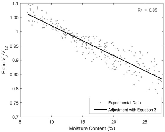 The pattern of VH vs. average MC during desorption varies within species [14,15]. Consequently, several researchers have performed corresponding adjustment factors for different species and moisture levels [16,17,18,19,20] tested three different tropical hardwoods, obtaining three different slopes (45, 55, and 66) ms−1.