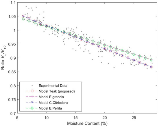 Assuming the previous considerations, the studied teak shows coefficients in the order of those obtained for larger pieces (metric scale) of Corymbia citriodora, being different from those of Eucalyptus grandis and Eucalyptus pellita. As is summarized in Table 3, teak experimental data were evaluated with the models for these three hardwoods species (H1), (H2), and (H3) developed by [20]. It must be considered that these species presented greater average densities (E. grandis (508 kg m−3), E. pellita (737 kg m−3), C. citriodora (813 kg m−3)) than teak (531 kg m−3).