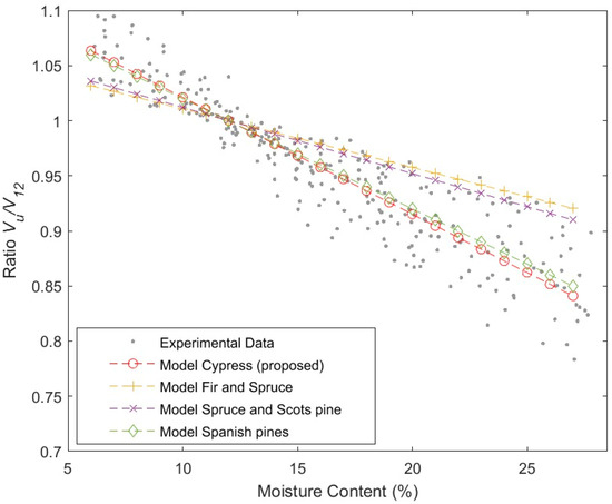The obtained results show a suitable fit in the models using the developed parameters, with high determination coefficients and low mean square errors, which means a good statistical fit in the order of other studies in the literature, taking into account that they were fitted with small clear specimens. It should be considered that MC influence is not totally independent of dimensions. According to [22] dimensions can also influence the measurement of MC during drying studies. The MC inside small clear specimens is more homogenous than it is in structural sizes, where a MC gradient can exist from the inside to the outside, and slenderness (length/width) may also affect low-frequency ultrasound devices (from 23 to 54 kHz) [22].