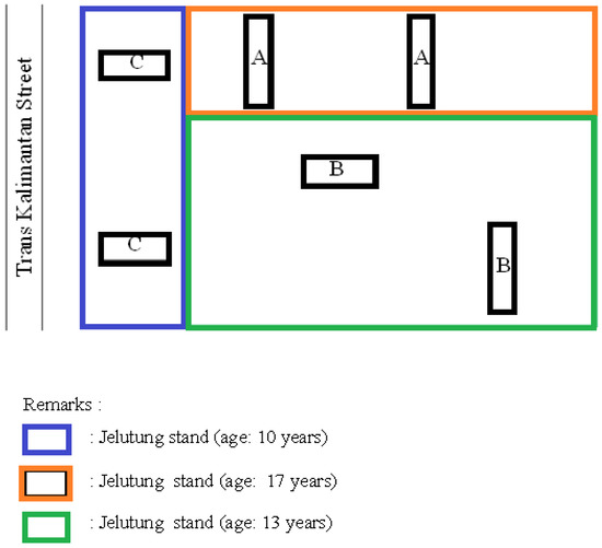 Carbon stock measurements were carried out on D. polyphylla located on communi-ty-owned land. The jelutung swamp stands were divided into 17 years, 13 years, and 10 years of age classes. The sketch of the research location is presented in Figure 2.