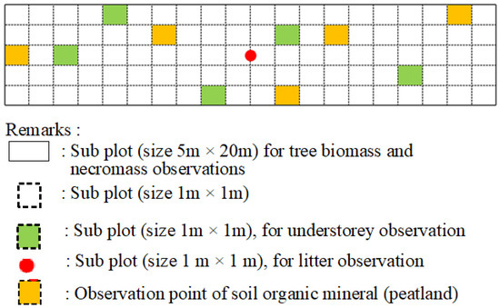 - Carbon storage in the litter necromass was dead biomass with a size larger than soil organic matter, as well as deadwood measuring <2.5 cm with a height <1 m that underwent a decay process on the surface or became soil organic minerals [14]. The plot for measuring carbon storage for litter types was a square with an area of 1 m2 (1 m × 1 m). Therefore, measurement plots of 10 units were randomly placed on the research subplot.