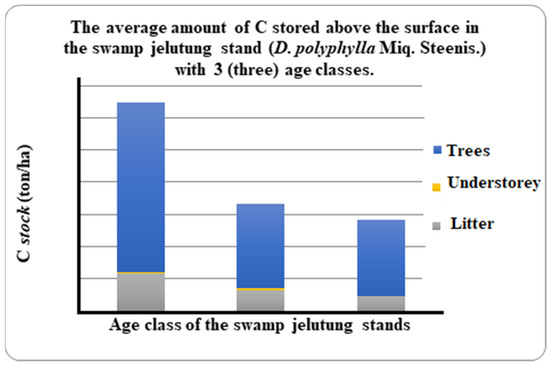 The most significant contribution to the total C stored in the subsurface is peat soil as its constituent component, but statistically, this is not the case. This indicates that the vegetation of the stems and roots are also two critical components in biomass allocation. This is closely related to the amount of C stored on the upper surface. In addition, the age of the tree/stand with a diameter affects the amount of biomass contained, and the amount of litter produced by D. polyphylla stands has an impact on biomass and C stored.