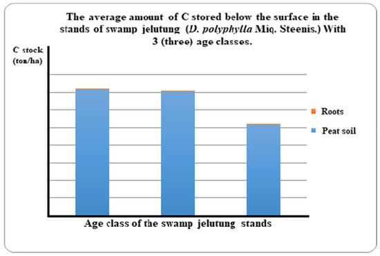 Storage was also found below the surface with constituent components, including the roots of the D. polyphylla trees and the peat soil. Figure 5 depicts the average amounts of C deposited belowground.