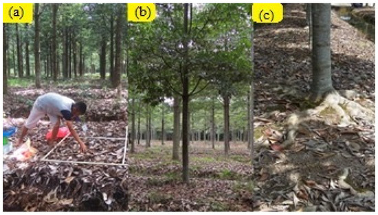 The condition of litter in jelutung stands for age classes I, II, and III. Remarks: (a) solid litter in age class I; (b) moderate litter in age class II; and (c) rare litter in age class III.