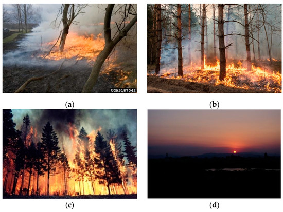 The data set established in this paper includes various forest fire images and images containing fire disruptors (sun). In order to ensure that our model can handle complex forest fire sources (ground fire, trunk fire, and canopy fire), in addition to obtaining data sets from the open-source fire data set website BoWFire [18] and others, we also used web crawler technology to obtain forest fire images from the Internet. The obtained data set was then manually filtered, and a forest fire data set containing 2976 images was created. Representative samples from the forest fire source image data set are randomly shown below in Figure 1.