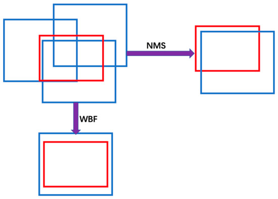 The traditional method of filtering prediction boxes is Non-Maximum Suppression (NMS). The filtering process of boxes depends on the selection of this single threshold IOU [23]. However, different thresholds may affect the final results of the model. If multiple objects exist side by side, one of them will be deleted. The NMS discards the redundancy box and therefore cannot effectively generate average local predictions from different models. It can be seen from Figure 2 that unlike NMS, the WBF [24] algorithm uses the confidence (score) of all prediction boxes to construct the fused box.