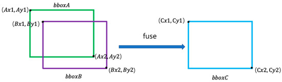 Taking two prediction boxes as an example, the calculation method of the weighted box generated by the fusion of two prediction boxes is described. Assuming that the two prediction boxes are , represent the coordinates of the upper left corner of the frame; represent the coordinates of the lower right corner of the frame, and represents the confidence degree of the frame. The same is true for . is obtained by combining and , as shown in Figure 3:
