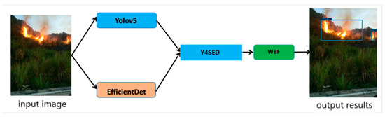 This paper proposes a new Yolov5-S and Efficientdet-D2 integration model, Y5SED, to solve the problem of missing detection caused by a single weakly supervised learning model and ensure that our model has better robustness to different scenarios. Figure 4 shows that this paper fused two separate weakly supervised models, Yolov5-S and Efficientdet-D2, to train forest fire data sets, saved the predicted results in Jason files, and then used the weighted boxes fusion algorithm (WBF) to fuse the prediction boxes of the two models. Experiments show that this method can greatly improve the detection accuracy of the model.