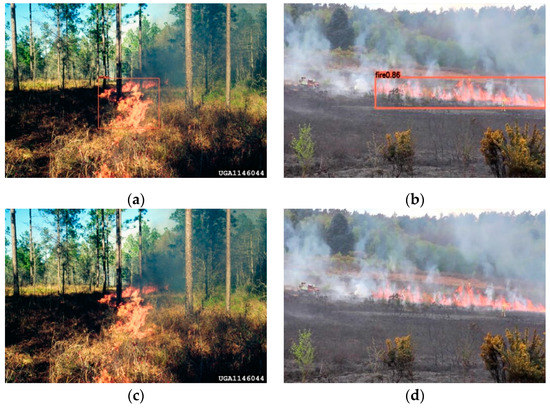 Through experimental observations, we found that Yolov5 is better at large-target fires as shown in Figure 5a,b, but sometimes misses objects (Figure 6). Meanwhile, even though EfficientDet is not sensitive to large-target fires (Figure 5c,d), it is more careful than YoloV5 and can identify more fires. Therefore, we believe that the combination of these two weak monitoring models with different specialties can effectively solve the problem of missing forest fire detection.