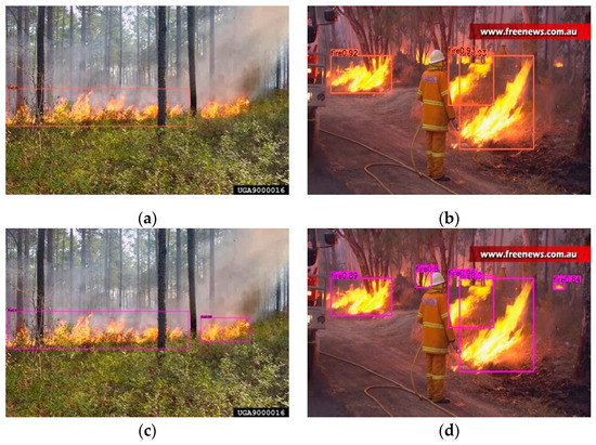 EfficientDet is a more “careful” target detector than Yolov5. (a) Yolov5 missed a flame target; (b) Yolov5 missed two flame targets; (c) EfficientDet detection of all flame areas; (d) EfficientDet detected five flame targets.