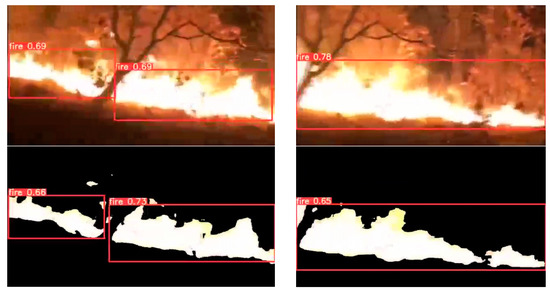 According to Table 7, compared with the traditional non-maximum suppression algorithm (NMS) and the screening prediction frame method for forest fire identification, the integrated model (Y4SED) established by using the weighted boxes fusion algorithm (WBF) in this paper obtains a higher average accuracy in forest fire identification and effectively solves the problem of missed detection of forest fire. In addition, the experimental results in Table 8 show that compared with the original individual model (Yolov5 and EfficientDet), the integrated model proposed in this paper (Y4SED) has significantly improved all indexes. When the IOU threshold is 0.5, the AP value of forest fire recognition by the integrated model can reach 87%. Yolov5-S and Efficientdet-D2 were improved by 4.5% and 2.5%, respectively, compared with a single weakly supervised learner. At the same time, the integration model in values of , , , , , , , and have significant advantages. Therefore, considering the result of the experiment, in terms of detection accuracy and algorithm operation space complexity, this article proposes the Y4SED model, which has a stronger anti-interference ability and is better able to distinguish between complex background and different kinds of forest fires (small fire, medium fire, large fire, strip-type fire, surface trunk, crown fire, and fire at night). In addition, there will be no false detection in the face of interfering objects similar to fire (such as the sun) (as shown in Figure 7), so it can more effectively complete the forest fire identification work. In addition, the model can not only detect whether there is a forest fire in real time through video (as shown in Figure 8), but also accurately locate the specific location of the fire, which plays a vital role in judging whether there is a forest fire and forest protection.