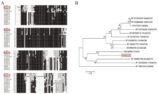Multiple sequence alignment (A) and phylogenetic analysis (B) of PwNAC38.