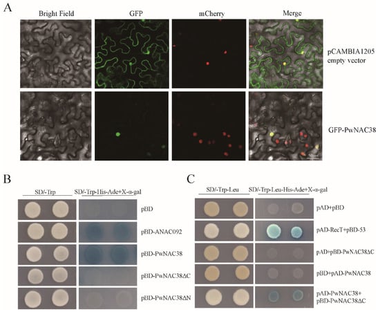 Functional verification of PwNAC38. (A) Subcellular localization assay. Transgenic tobacco with nucleus-located mCherry expression was used as the positive control. The bar in the image represents 50 μm. (B) Yeast trans-acting activity assay. pBD-ANAC092 was used as the positive control, and an empty pBD vector was used as the negative control. (C) Yeast two-hybrid assay for PwNAC38 forming homodimers. pAD-RectT+pBD-53 were used as the positive controls.