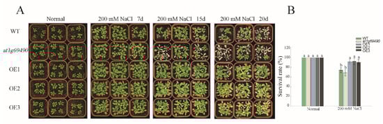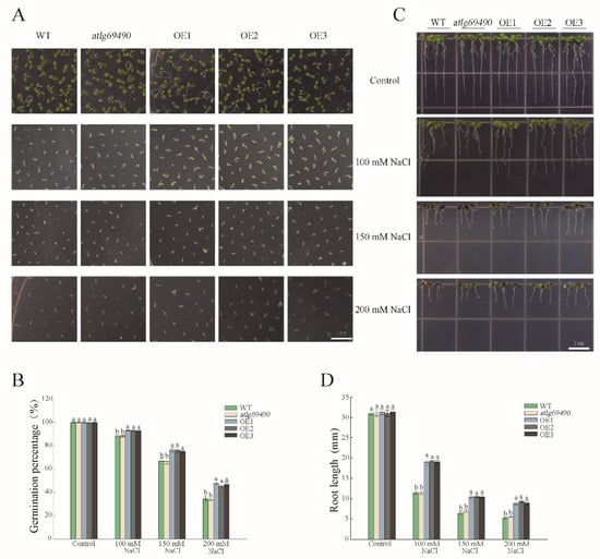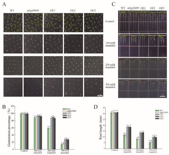 For the seed germination experiment, seeds of WT, OE and at1g69490 lines were sown in an MS medium with different concentrations of NaCl (100/150/200 mM) and mannitol (100/200/300 mM); vernalization was processed in a refrigerator at 4 °C for 2 days, and then transferred into an incubator (21 °C, 16 h light/8 h dark photoperiod, with 70% relative humidity). The germination percentage referred to the final germination condition, and the germination rate referred to the germination condition within a set time. Germinated seedlings were counted every day for 7 days. Seeds were considered to be germinated when radicles were at least 2 mm long.