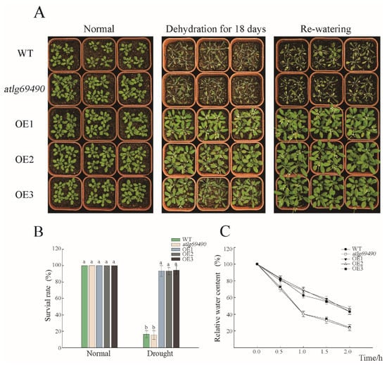 For survival assays, seeds of each line, after germination in an MS medium, were transformed into soil. The 2-week-old seedlings were used to conduct dehydration treatment for 14–20 days, followed by rewatering for 3 days. Survival rates and flowering time were recorded during this process. The plants with severe curling, wilting, browning and, finally, stunted growth were identified as dead plants. Plants after premature bolting and flower bud differentiation/inflorescence began to scatter, which was identified as the signal of flowering. For salt treatment, 2-week-old seedlings of each line grown in the ground were watered once every 3 days, with 200 mM NaCl solutions. Survival rates and phenotypic differences were recorded during this process. The plants with severe wilting and yellowing rosette leaves were identified as dead plants. All experiments had three duplications.