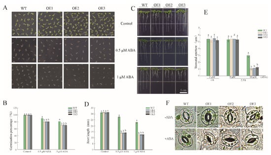 The procedure of germination and root elongation experiments was mentioned in Section 2.6 above. Seeds of each line were sown on MS and MS + 0.5 or 1.0 µM ABA, to observe growth state. Observation of stomatal aperture was conducted as previously described [21]. Briefly, the leaves from 4-week-old seedlings of each line were chosen and immersed in MES-KCl buffer, then placed under normal light conditions for 2.5 h, to open up all pores. The leaves were subsequently transferred into an MES-KCl buffer with 0 or 10 μM ABA for another 2.5 h, and observed for stomatal aperture under a biomicroscope (DM2500).