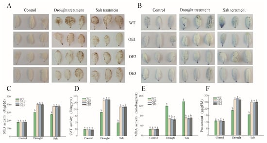 Drought and salt-induced changes in ROS elimination in WT and OE plants. (A) In vivo DAB staining to detect H2O2 content. (B) In vivo NBT staining to detect the content of O2 (C) SOD activity. (D) CAT activity. (E) MDA activity. (F) Proline content. The significantly different mean values at p ≤ 0.05 were labeled by different letters.