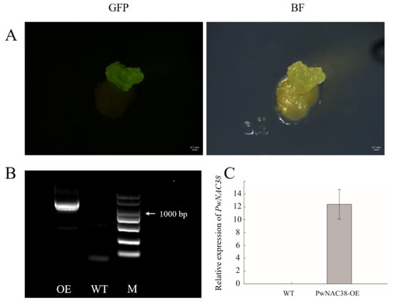 Identification of overexpressing PwNAC38 in apple calli. (A) Detection of PwNAC38-GFP fusion protein under GFP channel and Bright field. (B) Identification of PwNAC38 in transgenic apple calli. (C) Relative expression of PwNAC38 in transgenic apple calli.