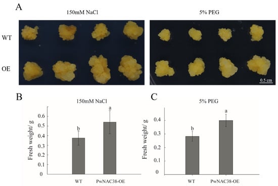 Calli of the apple (Royal Gala) was used for the phenotyping experiment. PwNAC38 was cloned into pSuper1300 to generate a 35S:PwNAC38-GFP construct. We transformed the agrobacterium EHA105 harboring 35S:PwNAC38-GFP into WT plants, as previously described [23]. The positive transgenic calli and WT materials were subcultured in an MS medium with appropriate concentration of 2,4-D (2,4-dichlorophenoxyacetic acid) and 6-BA, until they developed into tender and vigorous calli, then the similar-sized calli were placed in an MS medium with NaCl or PEG6000. The growth state of each group was observed, and the fresh weight was measured after 14 days.