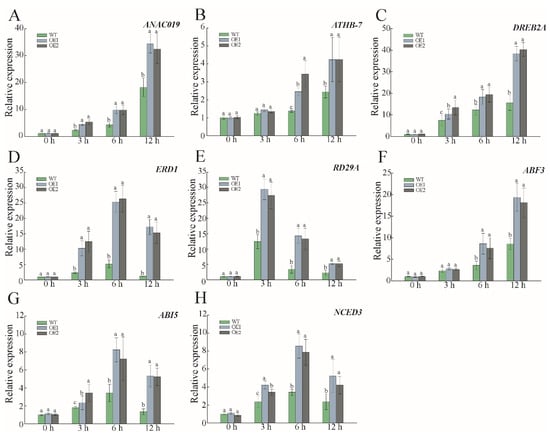 Due to the hypersensitivity of PwNAC38 to dehydration signals, and the potential involvement of the ABA pathway, we used a qRT-PCR assay to compare the expression levels of some drought-responsive and ABA-mediated genes, including ATHB-7, ANAC019, ERD1, DREB2A, RD29A, ABI5, ABF3 and NCED3. As shown in Figure 11, no significant differences were detected under control conditions, but these stress-responsive genes showed higher mRNA levels in OE lines after PEG6000 treatment, among which the relative expression of DREB2A reached a peak after 12-h treatment, and ERD1 was detected to be five times higher than in the WT groups (Figure 11D). Moreover, the key ABA-synthesis NCED3 and ABA-responsive ABF3 were also transcriptionally abundant in the presence of PEG6000 (Figure 11F,H). These results indicate that PwNAC38 increases drought tolerance in plants, via activation of the expression of stress-related and ABA dependent genes.