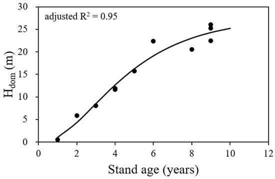 A stand age of 20 or 30 years is generally defined as the standard age for SI, but this is not fixed [17]. In the present study, a stand age of 10 years was used as the SI standard because harvesting occurs 8 years after planting in Vietnam. The results of the regression analysis of the Hdom growth model using the Chapman–Richards equation are shown in Figure 2.