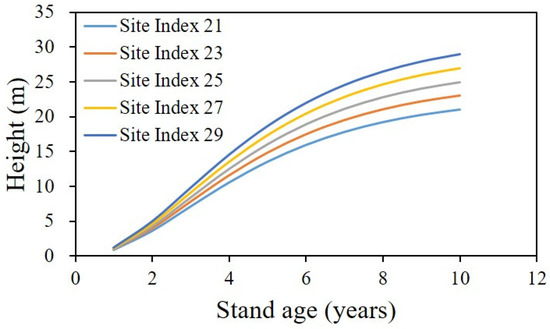 In addition, combining Equations (2) and (3) in the form of an algebraic differential equation derives the SI classification curve, which can produce various Hdom curves according to SI, Asi, and stand age.