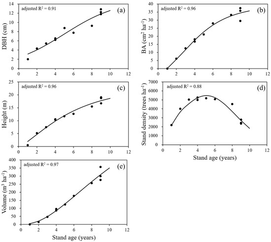 Stand growth curves: (a) diameter at breast height (DBH); (b) basal area (BA); (c) mean height (Hm); (d) stand density; and (e) stand volume, over stand age for Acacia hybrid plantations in southern Vietnam.