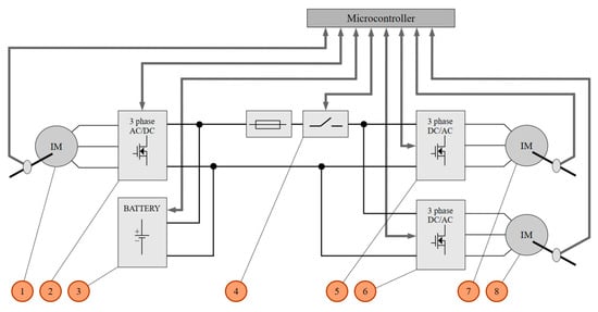 Block diagram of the hybrid trailer drive. 1, 7, 8—induction machine; 2, 5, 6—three phase DC/AC inverters; 3—battery; 4—circuit breaker (author: Petr Procházka).