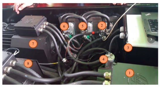The basic principle block diagram of the electric timber trailer drive is shown in Figure 2. The electric drive can be split into the control and power parts. The power part consists of an electric source (lead-acid battery (3)), which is able to supply the electric drive as well as store electrical energy. The battery choice was selected according to the character of the loading, the volume or mass limitations of the installation in the steering, and the size of the required capacity. Although the LFP batteries have excellent characteristics in many aspects, their need for advanced maintenance is a significant disadvantage in this application. This is why the technology of pure lead was finally more desirable. The reason for this is that these batteries are practically maintenance-free. They are suited to the pulse character of the load, and their price is more favorable in comparison to the lithium batteries. Thus, the power battery of the tractor-trailer unit consisted of SBSC11F cells (from EnerSys company [23]), whose rated capacity was 1.1 kWh at 20 °C. The battery capacity decreased significantly with decreasing temperature, as was tested in the laboratory (see Section 3). The rated voltage of the cell was 12 V. It follows that a necessary voltage of the battery could be reached by connecting 6 cells in the series, with a total voltage of 72 V and a capacity of 6.6 kWh. The battery was kept in an almost fully charged state by the electric generator (1), which was powered by the hydraulic motor fed by the tractor’s hydraulic pump. The generator and two electric motors (7, 8) were chosen as the three phase induction machines. To unify drive components, the same machine was selected for the generator as that used for the wheel drives. The parameters of the chosen motors were verified within a wide speed range by laboratory measurements. The three phase DC/AC converters (2, 5, 6) ensured the proper control of the electric motors and generator in all operational states (motor/generator mode). The DC/AC converter, made by Silixcon SL, with a continuous power of 24.5 kW and a voltage level of 72 V DC, was chosen to supply the electric motors and generator. This converter can be overloaded with an output of 36 kW for a period of 10 s. The DC/AC converters are sufficiently oversized due to their lower resistance to overloading and surrounding heat conditions. The whole power circuit was protected by a power fuse, and the electrical source (battery) could be disconnected from the electric drive by the power circuit breaker. The control part consisted of a main microcontroller, which controlled all the power parts and sensors of the electric drive and cooperated with the higher control system of the timber trailer. The layout of the individual components of the electric drive in the chassis is illustrated in Figure 3.